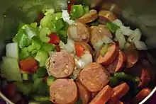 Traditionally, the meat includes sausage of some sort, often a smoked meat such as andouille, along with pork or chicken and seafood (less common), such as crawfish or shrimp. The vegetables are usually a sofrito-like mixture known as the "trinity" in Cajun cooking, consisting of onion, celery, and green bell pepper, though other vegetables such as okra, carrots, tomatoes, corn, chilis and garlic are also used.