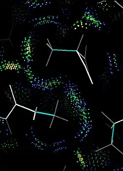 The Richardsons' more recent work has diversified beyond classification and crystallography. In the 1980s they stretched into the fields of synthetic biochemistry and computational biology as pioneers in the de novo design of proteins, a reverse engineering approach to make and test theoretical predictions about protein folding.[27] In the 1990s the Richardsons developed the kinemage system of molecular graphics and David Richardson wrote the Mage program to display them on small computers, for the then-new journal Protein Science.[28] Additionally, they developed all-atom contact analysis (see image) to measure "goodness of fit" inside proteins and in interactions with surrounding molecules.[4] The Kinemage website offers interactive exploration of various 3D protein structures through computer displays using their Mage or KiNG graphics programs. Funded by a National Institutes of Health (NIH) grant, the website is often used as a teaching tool. Textbooks and internet sites that have sourced images from Kinemages include Introduction to Protein Structure by Branden & Tooze,[29] Fundamentals of Biochemistry by Viet, Voet & Pratt,[30] Principles of Biochemistry by Horton et al.,[31] and the University of Mississippi's Kinemage Authorship Project.[32]