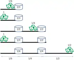 In the cars across the desert problem, the starting base has unlimited units of fuel. Each car can carry at most 1 unit of supplies at any time, and can travel 1 unit of distance on 1 unit of fuel. The other base is at m units of distance away. The cars can't leave fuel in the desert; However, at any point in a trip, accompanying cars can transfer fuel among themselves, as long as each car never carries more than 1 unit of fuel. Empty cars with no fuel are abandoned in the desert. The problem asks for the minimum number of accompanying cars needed to reach the other base. A variant of this problem gives the total number of cars available, and asks for the maximum distance that can be reached.