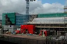 Following the publishing of the Development Brief, bids were made by developers for the site and a shortlisting process began. On 9 December 2002, RO St. Bernard's Ltd were selected as the preferred developers for the site.[37] A planning application for the site was submitted in 2005 and was approved in March 2006. The development on the 2.34-acre (9,500 m2) site was estimated to cost £63 million and will centre around a piazza.[38] 234 apartments were planned, although 140 of these were for the 'Jewellery Box' phase of the development which was designed by Associated Architects. The Jewellery Box was also planned to consist of 70,000 square feet (6,503 m2) office space, as well as retail units and arts/exhibition space alongside the 100 bedroom Travelodge hotel.[39] The Whitmore Warehouse in the centre of the site and 144 Newhall Street was converted as part of the scheme.[40] Demolition of the site commenced in September 2006 and constructed started in late 2007.[38] One of the buildings that were demolished was the James Watt building, which housed the oldest working steam engine in the world.[41]