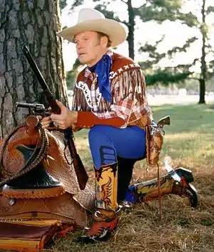After selling his store in the 1960s, Bowman became a salesman and began performing as The Straight Shooter in his spare time.[3] His gun tricks included being able to shoot an aspirin tablet at 30 paces, and being able to split a playing card edge-wise at 20 paces.[3] The guns he used included a pair of Ruger Blackhawk revolvers.[2] He went on to teach gun handling to Hollywood stars such as Robert Duvall and James Arness, and was a firearms instructor with law enforcement agencies, including the FBI.[3]
