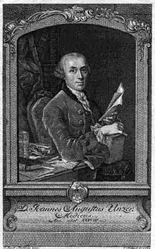 Johann August Unzer was born on April 27, 1727, in Halle an der Saale, to a family of medical practitioners. His brother Johann Christoph Unzer was a physician of royalty, and his father was also a notable physician.[2] At age twelve, he started to pursue his medical degree at the University of Halle,[3] his hometown university.[1] In his years at the university, he started exploring ideas such as emotion,[4] and also ideas regarding the central nervous system.[1] There, Unzer worked under a professor named Georg Ernst Stahl.[1] While still attending university, he defended Stahl's views on animism by publishing one of his first works called "Thoughts on the Influence of the Soul on its Body".[1] In 1748 at the age of twenty one, he received his MD.[4] In 1749, he went on to complete his dissertation entitled "De Nexu Metaphysices cum Medicina generatim"[1] and continued to work into the next year. After he graduated and completed his dissertational work, he went on to practice medicine in Hamburg, Germany while still developing his theories.[1] Around this time, he started to publish on neuro-metaphysical matters in the Hamburg Magazine.[1] He continued to do this until 1759, when he published his own medical journal called "The Physician".[1] In the following years, he published several books and articles ranging from zoology, "The Principles of Physiology", and afferent and efferent reflexes. He died on April 2, 1799, in Altona, Germany where he was living at the time.[2]