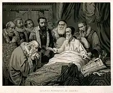 In late 1558, Calvin became ill with a fever. Since he was afraid that he might die before completing the final revision of the Institutes, he forced himself to work. The final edition was greatly expanded to the extent that Calvin referred to it as a new work. The expansion from the 21 chapters of the previous edition to 80 was due to the extended treatment of existing material rather than the addition of new topics.[80] Shortly after he recovered, he strained his voice while preaching, which brought on a violent fit of coughing. He burst a blood-vessel in his lungs, and his health steadily declined. He preached his final sermon in St. Pierre on 6 February 1564. On 25 April, he made his will, in which he left small sums to his family and to the collège. A few days later, the ministers of the church came to visit him, and he bade his final farewell, which was recorded in Discours d'adieu aux ministres. He recounted his life in Geneva, sometimes recalling bitterly some of the hardships he had suffered. Calvin died on 27 May 1564 aged 54. At first his body lay in state, but since so many people came to see it, the reformers were afraid that they would be accused of fostering a new saint's cult. On the following day, he was buried in an unmarked grave in the Cimetière des Rois.[81] The exact location of the grave is unknown; a stone was added in the 19th century to mark a grave traditionally thought to be Calvin's.[82]