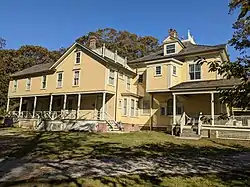The main house, roughly L-shaped, is composed of two distinct parts: the original farmhouse, built about 1850, and now the rear of the house; and the larger, more formal Colonial Revival mansion built from 1891 to 1892 and set perpendicular to it. The original section is a two-story, rectangular farmhouse, sheathed in clapboard and surmounted by a gable roof. The 1891 to 1892 section is a clapboarded, two-story structure with an elaborate façade with generous porch and surmounted by a steeply pitched, truncated hipped roof. Also on the property are contributing carriage house, equipment barn, garage, caretaker's cottage, swimming pool, storage hut, and archaeological sites. The property was purchased by Robert Barnwell Roosevelt (1829–1906) in 1873; his son John Ellis Roosevelt (1853–1939) commissioned the estate.[2]
