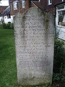 He was married and had at least five children including three daughters who died in childhood (see photograph of the family's tombstone). His wife Ann (born c.1739) died on 22 November 1802, aged 63. His two sons, Jack and Eli, also played senior cricket. Mrs Ann Small was a vociferous supporter of the Hambledon team and was a regular attendee at its matches, often travelling with the team to away games too.[19]