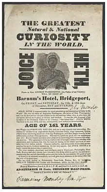 Lindsay introduced her as having been the childhood nurse of George Washington, but, lacking success, he sold her in her old age to P.T. Barnum.[2][3] Posters advertising her shows in 1835 included the lines, "Joice Heth is unquestionably the most astonishing and interesting curiosity in the World! She was the slave of Augustine Washington, (the father of Gen. Washington) and was the first person who put clothes on the unconscious infant, who, in after days, led our heroic fathers on to glory, to victory, and freedom. To use her own language when speaking of the illustrious Father of this Country, 'she raised him'. Joice Heth was born in the year 1674, and has, consequently, now arrived at the astonishing age of 161 years".[4]