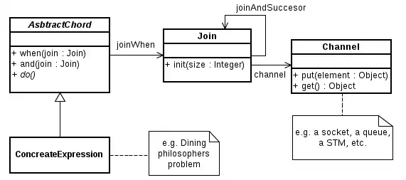 The join-pattern (or a chord in ) is like a super pipeline with synchronisation and matching. In fact, this concept is summarise by match and join a set of message available from different message queues, then handles them all simultaneously with one handler.[1] It could be represented by the keywords when to specify the first communication that we expected, with the and to join/pair other channels and the do to run some tasks with the different collected messages. A constructed join pattern typically takes this form: