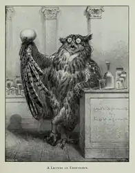 Wolf joined an association called the German Athenaeum which was founded in 1869 and members met for scientific, literary and musical evenings. For their exhibitions he worked on a range of compositions often with natural elements. His favourite medium was charcoal and ink. Wolf became treasurer to a fund for German widows during the Franco-Prussian War (War of 1870.) After the war, he met Daniel Giraud Elliot in Paris and visited a battlefield. He rendered the image in a design called "Peace and War" with turtle doves on a bush over a soldier's helmet. He also produces some cartoon like illustrations including "Lecture on Embryology" in which he taunts certain men of science.[22] When Charles Darwin began his study of animal expressions, he was introduced by Abraham Dee Bartlett, the zoo superintendent, to the abilities of Wolf in illustrating minute details of animals in action. Darwin requested Wolf to make some illustrations from photographs and living animals in the zoological garden. Wolf held his own opinions on the reliability of others' observations and even doubted Darwin's interpretation of the face of a monkey as a "laugh".[23] Darwin visited him on several occasions and Wolf appreciated him for being very approachable, someone that even "a child could talk to".[24]