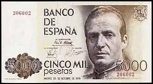 A 5,000-Spanish peseta note bearing the image of King Juan Carlos