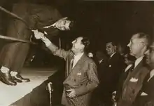 Perón's candidacy on the Labour Party ticket, announced the day after the 17 October 1945 mobilization, became a lightning rod that rallied an unusually diverse opposition against it. The majority of the centrist Radical Civic Union (UCR), the Socialist Party, the Communist Party and most of the conservative National Autonomist Party (in power during most of the 1874–1916 era) had already been forged into a fractious alliance in June by interests in the financial sector and the chamber of commerce, united solely by the goal of keeping Perón from the Casa Rosada. Organizing a massive kick-off rally in front of Congress on 8 December, the Democratic Union nominated José Tamborini and Enrique Mosca, two prominent UCR congressmen. The alliance failed to win over several prominent lawmakers, such as congressmen Ricardo Balbín and Arturo Frondizi and former Córdoba governor Amadeo Sabattini, all of whom opposed the Union's ties to conservative interests. In a bid to support their campaign, US Ambassador Spruille Braden published a white paper, otherwise known as the Blue Book[19] accusing Perón, President Farrell and others of Fascist ties. Fluent in Spanish, Braden addressed Democratic Union rallies in person, but his move backfired when Perón summarized the election as a choice between "Perón or Braden". He also rallied further support by responding to the "Blue Book" with his own "Blue and White Book", which was a play on the Argentine flag colors, and focused on the antagonism of Yankee imperialism.[20] He persuaded the president to sign the nationalization of the Central Bank and the extension of mandatory Christmas bonuses, actions that contributed to his decisive victory.[21] Perón and his running mate, Hortensio Quijano, leveraged popular support to victory over a Radical Civic Union-led opposition alliance by about 11% in the 24 February 1946 presidential elections.