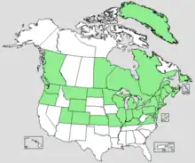 Juncus gerardii is mainly a coastal species, occurring at the high tide mark on the Mediterranean, Atlantic, Baltic and Black sea shorelines of Europe and the east coast of North America. Juncus gerardii is one of the many species identified by Eric Hultén as amphi-Atlantic plants, meaning that they have a disjunct distribution on both sides of the Atlantic, but are absent on the Pacific side of the globe.[1]:172 It also occurs inland in parts of eastern Europe, west and central Asia, particularly on saline soils. In North America, it occurs along the shorelines of areas once flooded by the sea, and as a weed along railway lines, for example in Minnesota.[1] In Indiana, it is the only Juncus species found in the Tipton Till Plain, a Till Plain in the Glacial till plains.[2]