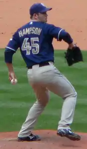 On August 10, 2008, Hampson pitched a scoreless fifth, sixth and seventh innings for the win after starter Chris Young gave up 7 runs in four innings in a 16-7 win over the Rockies. Hampson was released by the Padres on April 1, 2009.[1]