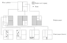 • Point pages: A collection of (point, location) pairs. In the case of databases, location may point to the index of the database record, while for points in k-dimensional space, it can be seen as the point's coordinates in that space.