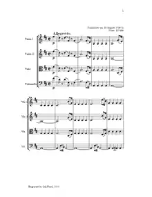 The String Quartet No. 20 in D major, K. 499, was written in 1786 in Vienna by Wolfgang Amadeus Mozart. It was published by – if not indeed written for – his friend Franz Anton Hoffmeister. Because of this, the quartet has acquired the nickname Hoffmeister. Hoffmeister had started issuing a series of chamber-music publications in 1785, including Mozart's K. 499 as well as Joseph Haydn's Op. 42.[1]