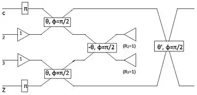 In the picture on the right, the labels on the left of the bottom box indicate the modes. The output is accepted only if there is one photon in mode 2 and zero photons in mode 3 detected, where the ancilla modes 2 and 3 are prepared as the state. The subscript is the phase shift of the output, and is determined by the parameters of inner optical elements chosen.[1] For case, the following parameters are used: , , , , , , and . For the case, the parameters can be chosen as , , , , , , and . Similarly, by changing the parameters of beam splitters and phase shifters, or by combining multiple NS gates, one can create various quantum gates. By sharing two ancilla modes, Knill invented the following controlled-Z gate (see the figure on the right) with success rate of 2/27.[5]