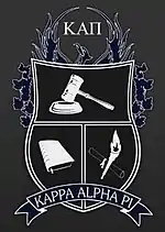The Kappa Alpha Pi crest features a shield decorated with a gavel, the Book of Knowledge, and a torch that symbolize law and justice.[12] At the base of the shield is a scroll with the fraternity's name.[12] Above the shield is the Wreath of Victory and a phoenix which represents the fraternity's history.[12]