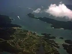![]() Kau Sai Chau and its golf course. Yim Tin Tsai and the breakwater are visible at the bottom right. The island at the centre right is Sharp Island. | |||||||||||||