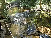 After the carvings, the river falls by 15 centimetres (5.9 in) to a clear water pool. As it flows over the holy lingams, the river attains a sanctified status and passes through the temples that are downstream.[5] The visible lingams are in a rectangular enclosure with a channel flowing out, which is interpreted to represent the yoni as the "female principle". Beyond these lingams, the river stretch of about 40–50 metres (130–160 ft) includes a small rocky island and ends over a fall into a pool. In this stretch of the river, there are bas reliefs on the rock faces. It has been inferred that one of the bas reliefs in this stretch, the central figure, unrecognizably damaged, could be that of Shiva as an ascetic, similar to the bas relief seen in Angkor Wat temple. The meaning of the crocodile carving seen here has not been ascertained. Near to this location, a boulder has been carved as a frog. The pond, in a rectangular shape, filled with water at all times, has many "Reclining Vishnu" carvings on the walls, and here again, a pair of crocodiles are carved but with their tail held by women. The small island formed in this stretch of the river has carvings of Shiva and Uma mounted on a bull.[1]