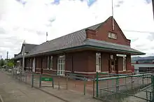 Kelso's first train station was built for the Northern Pacific Railroad. The first small depot was a wooden structure in the 100 block of Front or First Avenue. By 1906 the citizens of Kelso petitioned the Northern Pacific Railroad for a better passenger and freight depot. This was granted and a new, brick passenger and a wood freight depot was built. A grand opening reception was held February 12, 1912.[3][4] The line was also operated by passenger trains by the Great Northern Railway and Union Pacific Railroad under a joint service agreement.