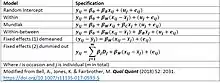 • He (with colleagues) has challenged the 'gold standard' that fixed effects should be the standard approach to the analysis of Panel data and that a Hausman test is an appropriate way of choosing between a Fixed effects model and a Random effects model. Somewhat controversially they argue that a particular form of the random effects model (the within-between model or the similar Mundlak model) offers all that fixed effects can provide and more.[16][17][18] They also challenge the Fixed Effects Vector Decomposition (FEVD) model of Plumper and Troeger.[19] One reaction was: "This paper and the instructive controversial over FEVD have shown me that my econometrics training had not - as I once assumed - taught me all that there is to know about fixed effects estimation. In particular, the authors' treatment of 'heterogeneity bias' clarifies the importance of addressing both 'within' and 'between' variation in the data and they make a compelling case for considering both 'individual' and 'ecological' influences".[20] Another was: "Bizarre and often incorrect paper by two political scientists on the virtues of random-effects over fixed-effects".[21] to "You can and should use a well-specified random effects model. Always.".[22] These models shown algebraically in the table for a two-level panel model