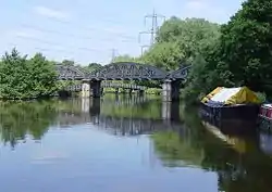 Kennington Railway Bridge from downstream. Beyond the bridge can be seen the crossing at the confluence of Hinksey Stream.