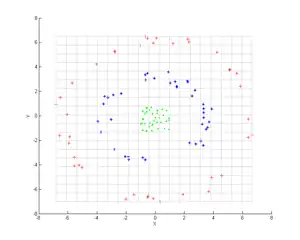 Note in particular that the first principal component is enough to distinguish the three different groups, which is impossible using only linear PCA, because linear PCA operates only in the given (in this case two-dimensional) space, in which these concentric point clouds are not linearly separable.