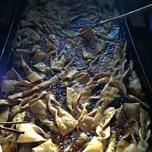 Khapse (from Tibetan: ཁ་ཟས་), Khapsey or colloquially known as amjok (from Tibetan ཨམ་བྱོག་ (Ear)) is a deep-fried Tibetan biscuit[1] that is traditionally prepared during the Tibetan New Year or Losar.[2][3] The dough for the khapse is usually made with flour, eggs, butter and sugar and is then shaped into different shapes and sizes. Some are sprinkled with powdered sugar, while other shapes, such as the donkey ear-shaped khapseys, decorative.[4]