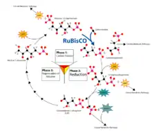 - ↑ Pierce J, Lorimer GH, Reddy GS (1986). "Kinetic mechanism of ribulosebisphosphate carboxylase: Evidence for an ordered, sequential reaction". Biochemistry. 25 (7): 1636–1644. doi:10.1021/bi00355a029.