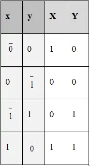 The state table of graph of interactions in figure D is shown in figure G. This table states for each state of the variables (x, y) i.e. present or absent, which products are synthesized and which are not synthesized at a significant rate. Consider the state 00/10, in which both of the gene products are absent but gene X is on. As product x is absent but being synthesized so it can be expected that in near future it will be present and the logical value of x will change from 0 to 1. This can be described by the notation Ō, in which the dash above the digit is due to the fact that variable x is committed to change its value from 0 to 1. Generally, a dash over the figure representing the logical value of a variable each time this value is different from that of the corresponding function. The state just considered can thus be represented as ŌO.