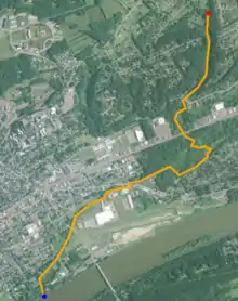 Satellite map of Kinney Run. The red dot is the stream's source and blue dot is its mouth.