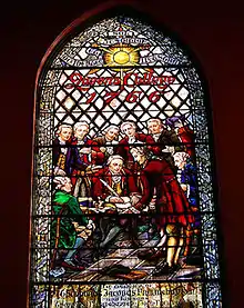 Four of the chapel's windows were designed and crafted in the studios of Louis Comfort Tiffany (1848–1933).[59][60] Tiffany and Hardenbergh were acquainted through their work with the Architectural League of New York.[60] According to the New Jersey Historic Trust, the windows are "some of the first opalescent and multicolored sheet glass manufactured in America."[61] Opalescent glass, used often in Tiffany glass windows, is glass in which more than one colour is present and caused in the manufacture by fusing through two colors being laminated, or through a superficial application of metallic oxide solutions.[62]