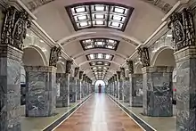 Line 1 of the Saint Petersburg Metro, also known as Kirovsko-Vyborgskaya Line (Russian: Ки́ровско-Вы́боргская ли́ния) or Red Line, is the oldest rapid transit line in Saint Petersburg, Russia, opened in 1955, which connects Kirovsky and Vyborgsky districts of the city. The original stations are very beautiful and elaborately decorated, especially Avtovo and Narvskaya. The line connects four out of five Saint Petersburg's main railway stations. In 1995, a flooding occurred in a tunnel between Lesnaya and Ploschad Muzhestva stations and, for nine years, the line was separated into two independent segments (the gap was connected by a shuttle bus route). The line is also one of the two lines in the network to feature shallow stations, the other being the Nevsko-Vasileostrovskaya Line.