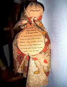 A kitchen witch, sometimes called a cottage witch[1] is a homemade poppet or doll resembling a stereotypical witch or crone displayed in residential kitchens as a good luck charm[2] and to ward off bad spirits.[3]