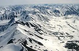 The Koryak Mountains or Koryak Highlands (Russian: Корякское нагорье) are an area of mountain ranges in Far-Eastern Siberia, Russia, located in Chukotka Autonomous Okrug and in Kamchatka Krai, with a small part in Magadan Oblast. The highest point in the system is the 2,562-metre high (8,406 ft) Mount Ledyanaya, located in the Ukelayat Range,[2] in the central part of the mountains.[3]