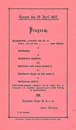 Kullervo premiered on 28 April 1892 at a sold-out concert audience in the Ceremonial Hall of the Imperial Alexander's University of Finland, Sibelius—initially pale and trembling—conducting. The soloists were the Finnish mezzo-soprano Emmy Achté and baritone Abraham Ojanperä.[8] The audience—a mix of the regular concert-going public and patriots there for the nationalist spectacle[8]—received two leaflets: first, a Swedish-language program that described Kullervo as a "symphonic poem" ("symfonisk dikt"); and second, text in Finnish, (with a Swedish translation) from The Kalevala for Movements III and V, as well as a motto that helped it to contextualize the instrumental Movement IV.[10] Notably, this was the first time in history that a concert audience had been given a Finnish-language text.[11] Although the orchestra overpowered Ojanperä and Achté,[8] the performance was a success: enthusiastic applause erupted after each movement and, at the end, Kajanus presented Sibelius with a blue-and-white-ribboned laurel wreath that quoted prophetically lines 615–616 of Runo L of The Kalevala: "That way now will run the future / On the new course, cleared and ready".[12] The next day, Kullervo received its second performance—again under Sibelius's baton—at a matinée concert, and on 30 April, Kajanus conducted the fourth movement at a popular concert that concluded the season.[13][9][lower-alpha 3]