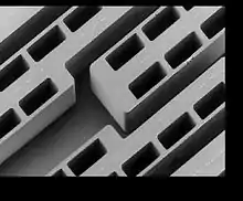 SEM picture of a polymer LIGA structure made by moulding. Smallest polymer width is 6 µm; polymer height is 120 µm, the aspect ratio is, therefore, 20.