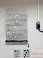 Laboratory drying rack is a pegboard for hanging and draining glassware in a laboratory. It is available in different varieties and sizes. It can be used for different materials of glassware in the laboratory room such as funnels, pipettes, mixing balls, slides, bottle stoppers, tubing and so on.[1] In addition to that, the pegs on the drying rack are easily removable and replaceable in order to maintain the cleaning of the lab racks to avoid contamination with other apparatus used on the same rack.[2] Any common laboratory needs to have at least two or three drying racks per lab.[3]
