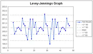 A Levey–Jennings chart is a graph that quality control data is plotted on to give a visual indication whether a laboratory test is working well. The distance from the mean is measured in standard deviations. It is named after Stanley Levey and E. R. Jennings, pathologists who suggested in 1950 that Shewhart's individuals control chart could be used in the clinical laboratory.[5] The date and time, or more often the number of the control run, is plotted on the x-axis. A mark is made indicating how far the actual result was from the mean, which is the expected value for the control. Lines run across the graph at the mean, as well as one, two and three standard deviations to either side of the mean. This makes it easy to see how far off the result was.