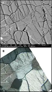 - ↑ Losiak, Anna; Golebiowska, Izabela; Ferrière, Ludovic; Wojciechowski, Jacek; Huber, Matthew S.; Koeberl, Christian (2016-04-01). "WIP: A Web-based program for indexing planar features in quartz grains and its usage". Meteoritics & Planetary Science. 51 (4): 647–662. Bibcode:2016M&PS...51..647L. doi:10.1111/maps.12614. ISSN 1945-5100.
