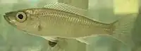 The second group, the tilapia, comprises only six species in two genera in Lake Malawi: The redbreast tilapia (Coptodon rendalli), a widespread African species, is the only substrate-spawning cichlid in the lake.[10][66] This large cichlid mainly feeds on macrophytes.[10][67] The remaining are five mouthbrooding species of Oreochromis; four chambo in the subgenus Nyasalapia (O. karongae, O. lidole, O. saka and O. squamipinnis) that are endemic to the Lake Malawi system, as well as the closely related O. shiranus, which also is found in Lake Chilwa.[10][44][60] The Malawi Oreochromis mainly feed on phytoplankton, reach lengths up to 26–42 cm (10–17 in) depending on the exact species, and are mostly black or silvery-gray with relatively indistinct dark bars.[10][60][68] Male chambo have unique genital tassels when breeding, which aid in egg fertilisation in a manner comparable to the egg-spots on the anal fin of haplochromines.[10][44]