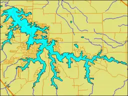 Map - the lake's irregular shape reveals its origins as a dammed river amidst hilly terrain.