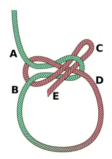 A way to tie the knot is shown in the image to the left. The orientation of the green bight is important: Its working end should end up on the same side as the red lines slip bight, or as the red working end when tying the non-slip version (A & C). If they end up on opposite sides (B & C), the resulting knot is much weaker and tends to slip, because then the two standing parts lose some of their binding force due to mutual friction before they can clamp down the loose ends. (The same is true for the bowline.)