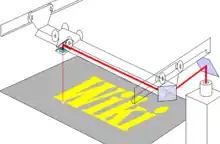 A typical setup of a laser table involves the fixed laser emitting light parallel to one axis of the table aimed at a mirror mounted on the end of an adjustable rail. The beam reflects off the mirror angled at 45 degrees so that the laser travels a path exactly along the length of the rail. This beam is then reflected by another mirror mounted to a movable trolley which directs the beam perpendicular to the original axis. In this scheme, two degrees of freedom (one vertical, and one horizontal) for etching can be represented.