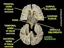 The anterior horn of the lateral ventricle is also known as the frontal horn as it extends into the frontal lobe. The anterior horn connects to the third ventricle, via the interventricular foramen. This portion of the lateral ventricle impinges on the frontal lobe, passing anteriorly and laterally, with slight inclination inferiorly. It is separated from the anterior horn of the other lateral ventricle by a thin neural sheet - septum pellucidum, which thus forms its medial boundary. The boundary facing exterior to the ventricle curvature is formed by the corpus callosum - the floor at the limit of the ventricle is the upper surface of the rostrum (the reflected portion of the corpus callosum), while nearer the body of the ventricle, the roof consists of the posterior surface of the genu. The remaining boundary - that facing interior to the ventricle curvature - comprises the posterior edge of the caudate nucleus. Frontal horn cysts are sometimes found on the frontal horn as a normal variant.[2]