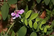 Lathyrus polyphyllus is a species of wild pea known by the common name leafy pea. It is native to the western United States from Washington to northern California, where it grows in forest and other habitat. This is a perennial herb with long leaves each made up of many pairs of oval-shaped leaflets a few centimeters long. The leaf also has tendrils which may be long, branched and coiled, or just a short bristle. The stipules are large as well, often over a centimeter wide. The plant produces an inflorescence of up to 12 pea flowers usually arranged in a line along one side of the stem. The flowers are up to 2 centimeters wide and are a variety of shades of purple. The fruit is a dehiscent legume pod containing peas.