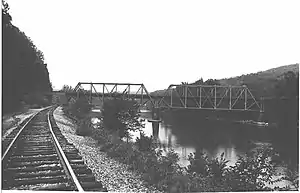 The Layton Bridge is a Pratt truss bridge over the Youghiogheny River in Layton, Pennsylvania. Originally built for the Washington Run Railroad, construction began 1893 and was completed in 1899. The last train crossed in 1931. The bridge and a tunnel immediately to its south were converted to a single automobile lane in 1933 as part of a road that connects Layton with Perryopolis, near the suspected location of the eighteenth-century Spark's Fort.