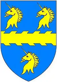 Arms of Lear: Azure, a fess raguly between three unicorn's heads erased or, as visible on the mural monument to Sir Peter Lear in Bishopsteignton Church, Devon