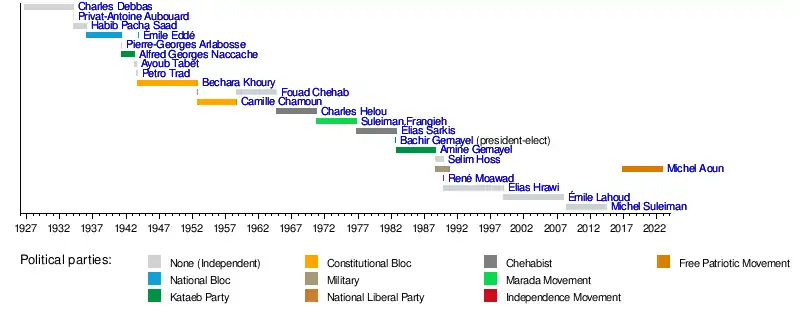 Michel SuleimanÉmile LahoudElias HrawiRené MoawadMichel AounSelim HossAmine GemayelBachir GemayelÉlias SarkisSuleiman FrangiehCharles HelouCamille ChamounFouad ChehabBechara El KhouryPetro TradAyoub TabetAlfred NaccachePierre-Georges ArlabosseÉmile EddéHabib Pacha SaadPrivat-Antoine AubouardCharles Debbas