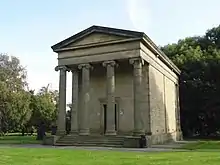 The cemetery chapel, built in 1835, is grade II listed along with a statue of Michael Sadler.[6] The cemetery lodge,[7] the Leeds Fire Brigade Memorial[8] and several groups of monuments[9][10][11] are also grade II listed.