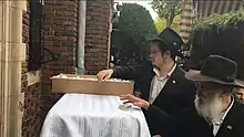Haredim giving lekach to members of the community prior to Yom Kippur in exchange for a donation to charity, a tradition started by the Lubavitcher Rebbe.[3]